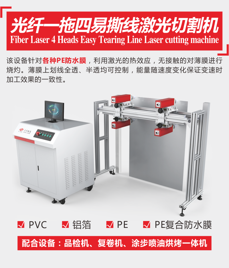 防水膜易撕线激光打标机,适用于自粘式/防水/防潮卷材、防水胶带等材料。速度快、使用方便,适用于有新工艺要求的防水膜厂家。加工速度≥230米/分,可配合吹膜机、涂布机、分切机使用。