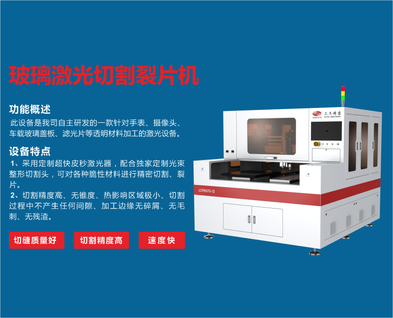 在消费类3C电子行业,随着消费者对产品高质量的追求,促使供应商对手机屏、摄像 头玻璃类盖板及屏幕类脆性材料产品加工制造上提出更高的要求,如切割强度高、崩 边小、生产效率高、成本低、行业领先的工艺等高技术加工要求,而传统的CNC加工 存在切削液对环镜污染,钻头等刀具磨损,加工效率低下,需要更多的设备、人力及 更大的场地面积,直接导致成本超高。我司研发生产的玻璃激光切割裂片机一次性解决了以上所有问题。