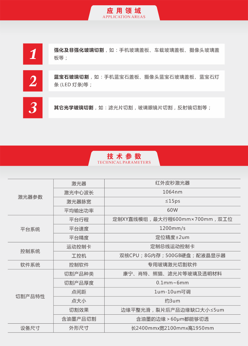 1、强化及非强化玻璃切割,如:手机玻璃盖板、车载玻璃盖板、摄像头玻璃盖板等;