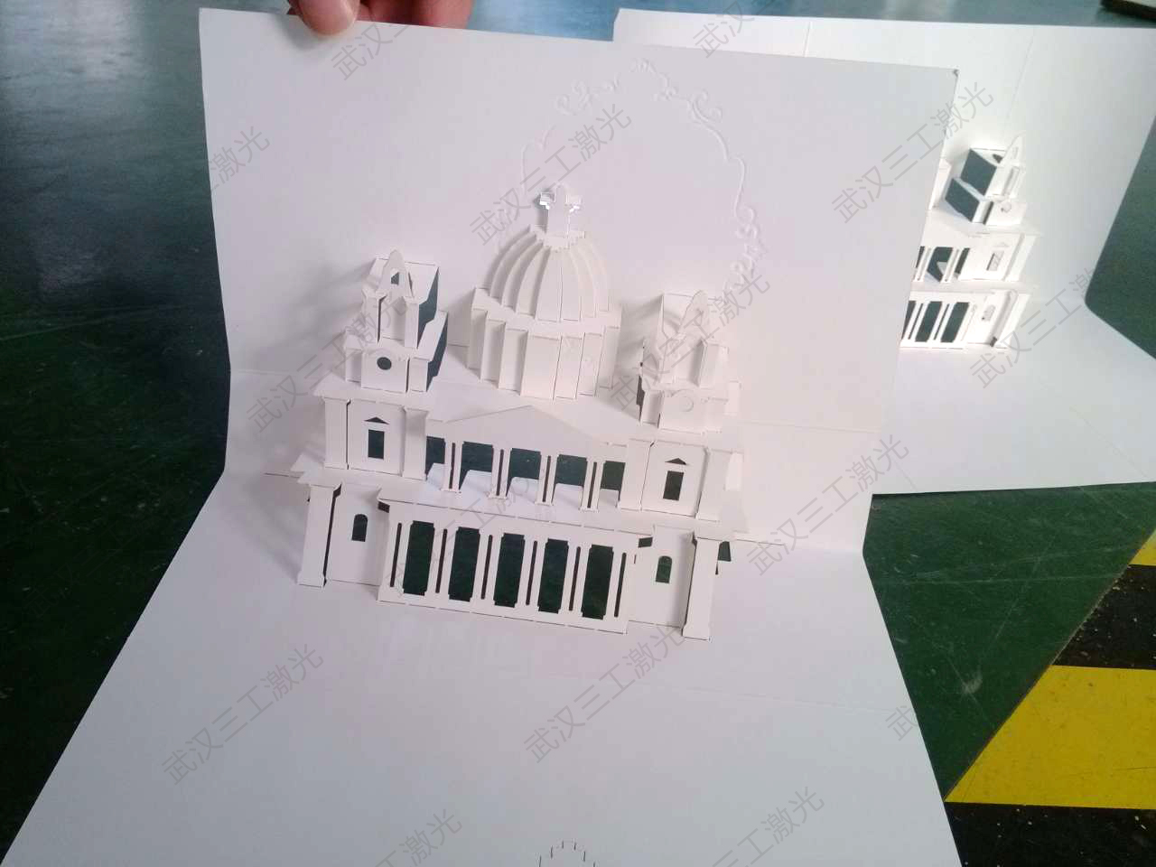 激光镂空雕刻的立体纸质工艺品图案具有很强的立体感,造型独特新颖,图案细腻美观。建筑纸模激光雕刻设备具有加工精度高、自动化程度高、加工速度快、加工效率高、操作简单方便等特点,利用激光束能量密度高的特性,将纸品切穿并产生镂空或半镂空图案的加工方式。